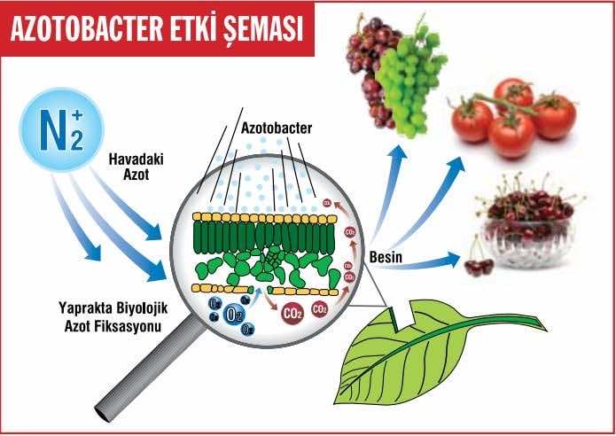 Bu organizmalardan Azotobacterler spp. havanın serbest azotunu azot fiksasyonu ile organik azota ve nitratlara dönüştürürler. Azotobacter spp. türlerine ait mikroorganizmalar serbest yaşayarak herhangi bir bitki ile simbiyotik (ortak) bağ içermeden havanın gaz haldeki azotunu hücreleriyle fikse edip besin olarak kullanılır duruma getirirler. Böylece yapay yoldan elde edilen azot yerine doğal yollardan bitkiler için gerekli besin sağlanmış olur. Ayrıca azotobacter türleri salgıladıkları ; metabolitler, vitaminler, bitki gelişim düzenleyici maddeler ile bitkiyi birçok hastalığa karşı korurken, bitkide istenen belirgin bir verim ve kalite artışını da sağlarlar.